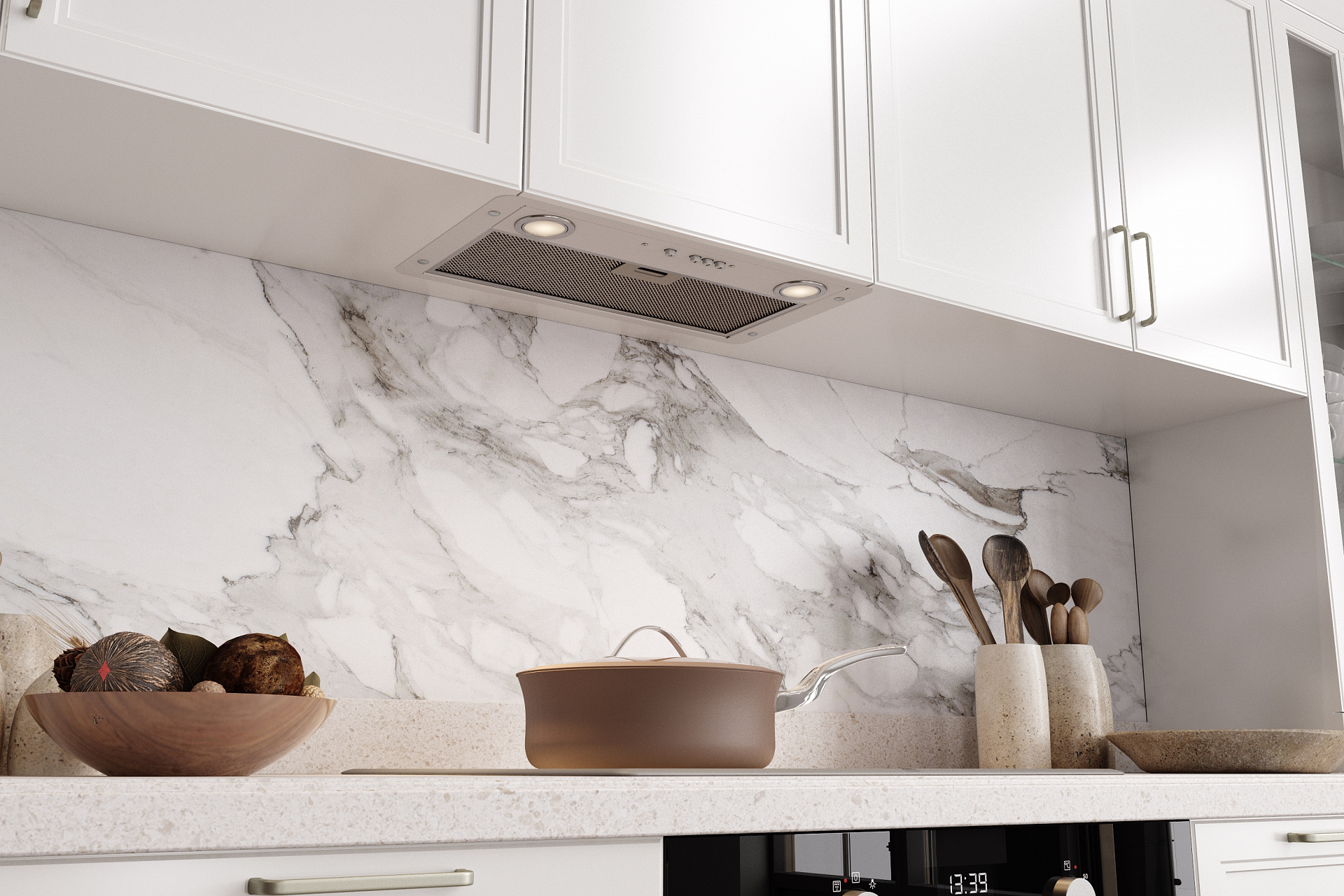 Благодаря плоской нижней панели корпуса, встроенная в шкаф вытяжка абсолютно незаметна после установки. Это позволяет интегрировать вытяжки Elikor в интерьер любого стиля и формата.