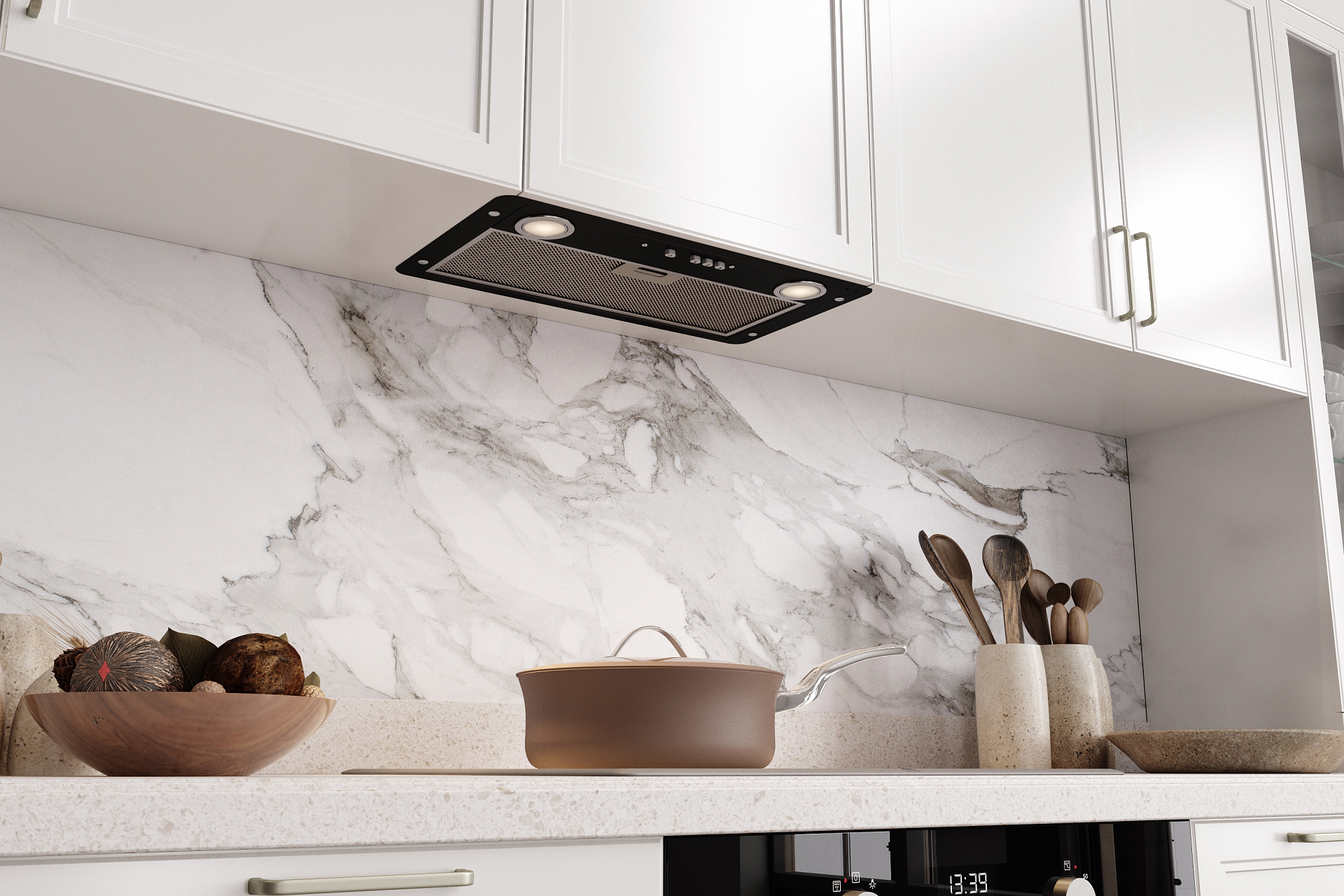 Благодаря плоской нижней панели корпуса, встроенная в шкаф вытяжка абсолютно незаметна после установки. Это позволяет интегрировать вытяжки Elikor в интерьер любого стиля и формата.