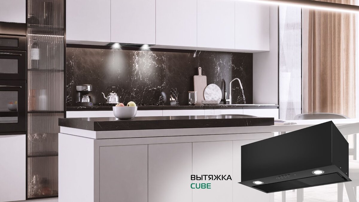 Несмотря на название, полностью встраиваемая вытяжка Cube не имеет строгой кубической формы, но её ширина 60 см делает её удобной для стандартных ниш. Кроме того, в шкафчике останется место для хранения кухонных аксессуаров.